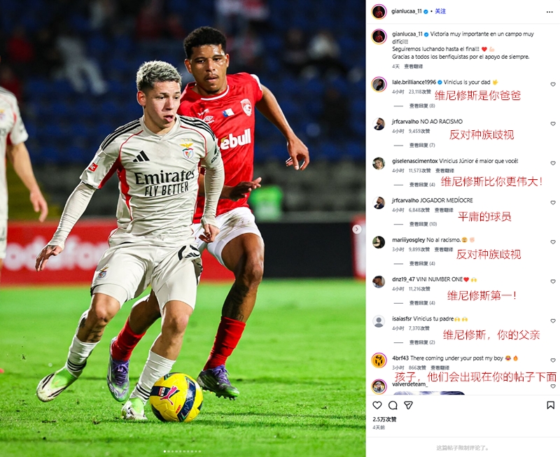 目前普雷斯蒂亚尼最新一篇ins帖子下高赞评论声援维尼修斯,批评普雷斯蒂亚尼。球员社媒目前限制评论。