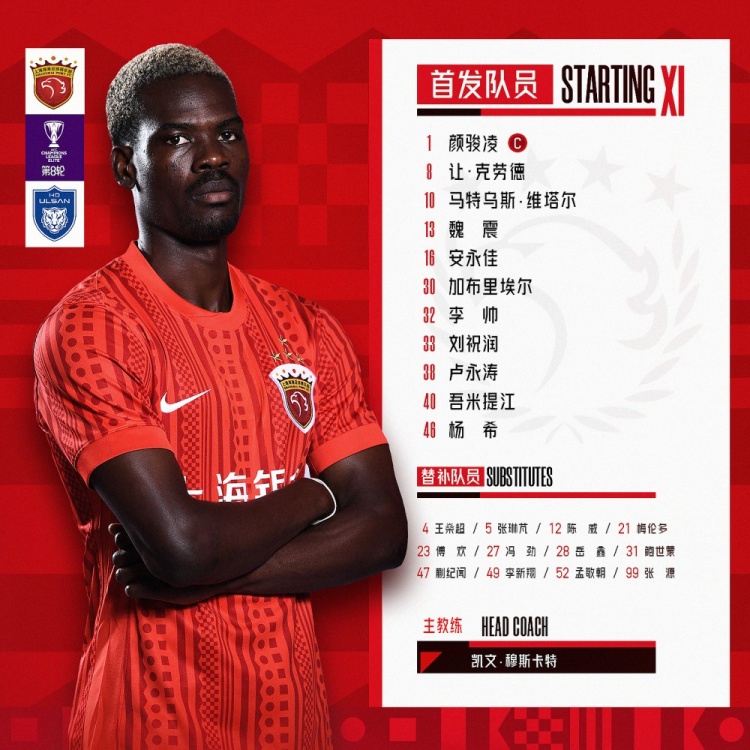 2025/2026亚冠精英联赛第8轮,上海海港vs蔚山HD今日首发名单