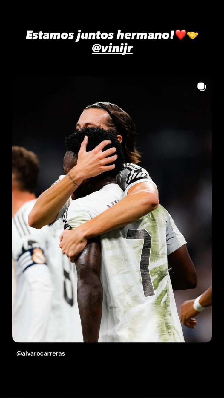 卡雷拉斯社媒晒出拥抱维尼修斯的照片,配文:“我们与你站在一起,兄弟。”