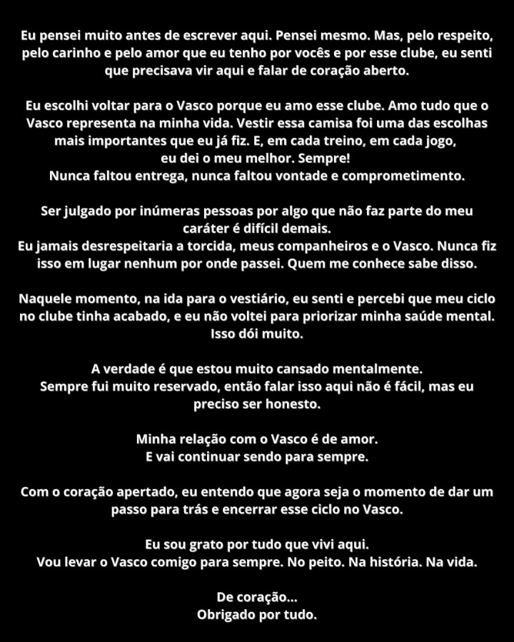 我选择回到瓦斯科达伽马是因为我对俱乐部的热爱。我热爱这里的一切,甚至超过了我过去的一切。在每一次训练和每一场比赛中,我都全力以赴。我从未缺乏奉献精神、意愿和责任感。