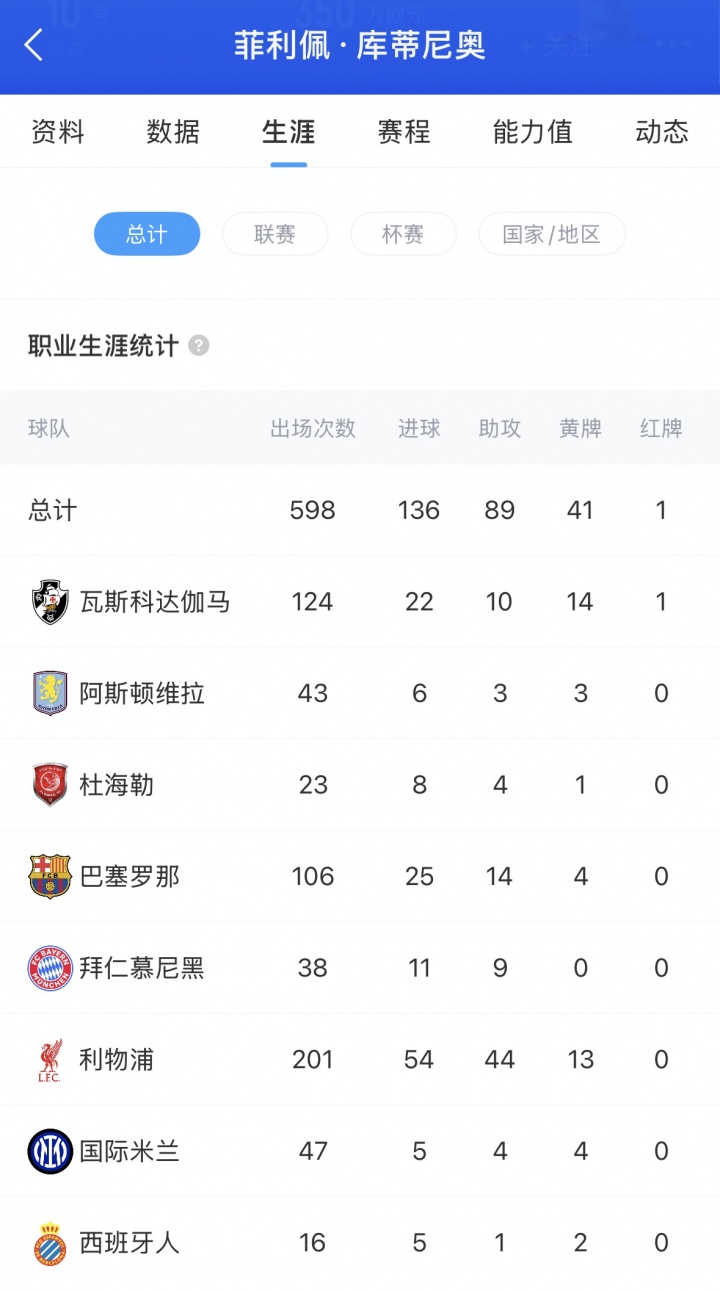 库蒂尼奥今年6月满34岁,德转身价350万欧。曾效力利物浦、巴萨、拜仁、国米等队。两次效力瓦斯科达伽马期间共代表球队出场124次,打进22球,送出10次助攻。