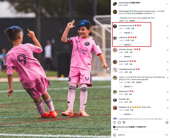 名记罗马诺也发布了这一动态,随后梅西的妻子安东内拉和苏亚雷斯的妻子索菲亚先后评论道:😍😍😍