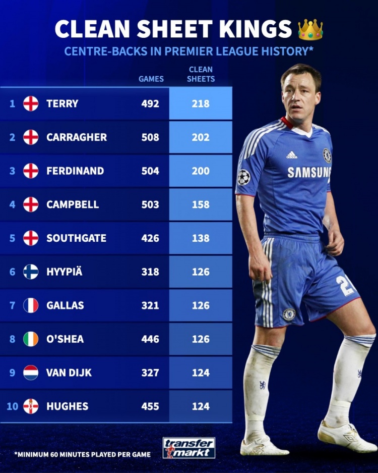 直播吧2月20日讯 德国转会市场统计了英超历史中卫零封的场次,并列出榜单,特里218场居首,卡拉格、费迪南德二三位。