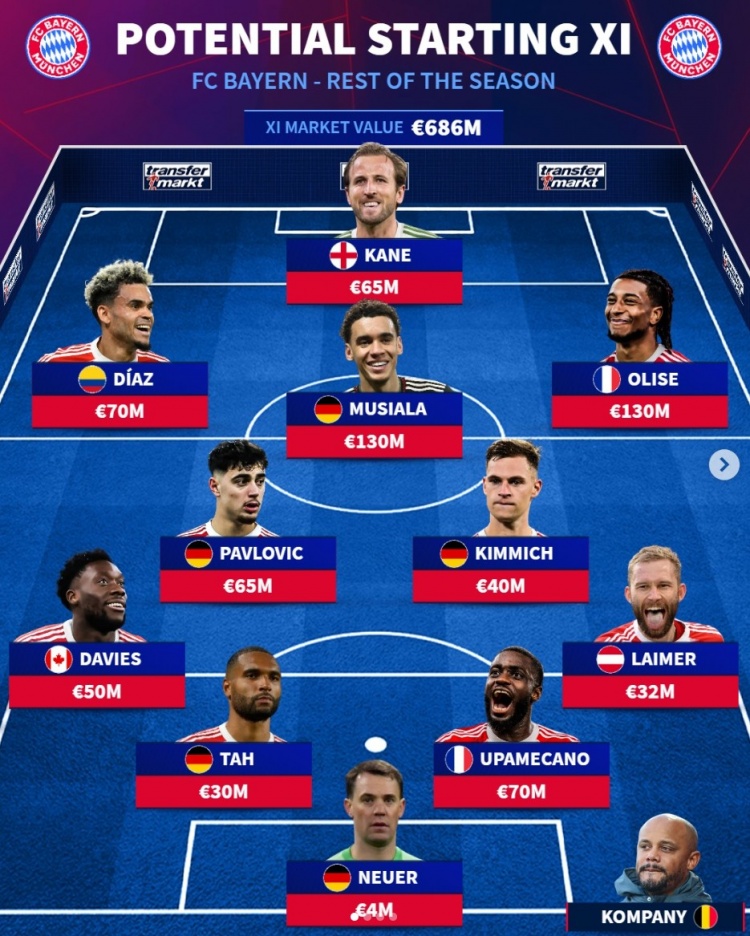 直播吧2月20日讯 《转会市场》预测了拜仁在本赛季剩余时间的主力阵容,随着穆西亚拉伤愈,凯迪拉克前场四重奏(凯恩-迪亚斯-穆西亚拉-迈克尔·奥利塞)组合也呼之欲出。