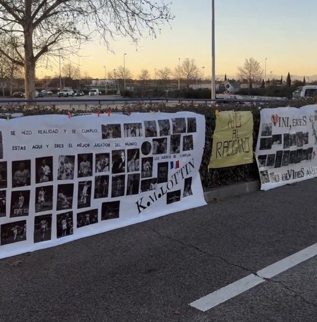 直播吧2月21日讯 皇家马德里球迷在球场外挂起横幅,声援维尼修斯以及姆巴佩,以示对他们反种族歧视斗争的支持。