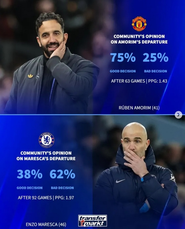 阿莫林(曼联):63场,场均1.43分。75%支持,25%反对。