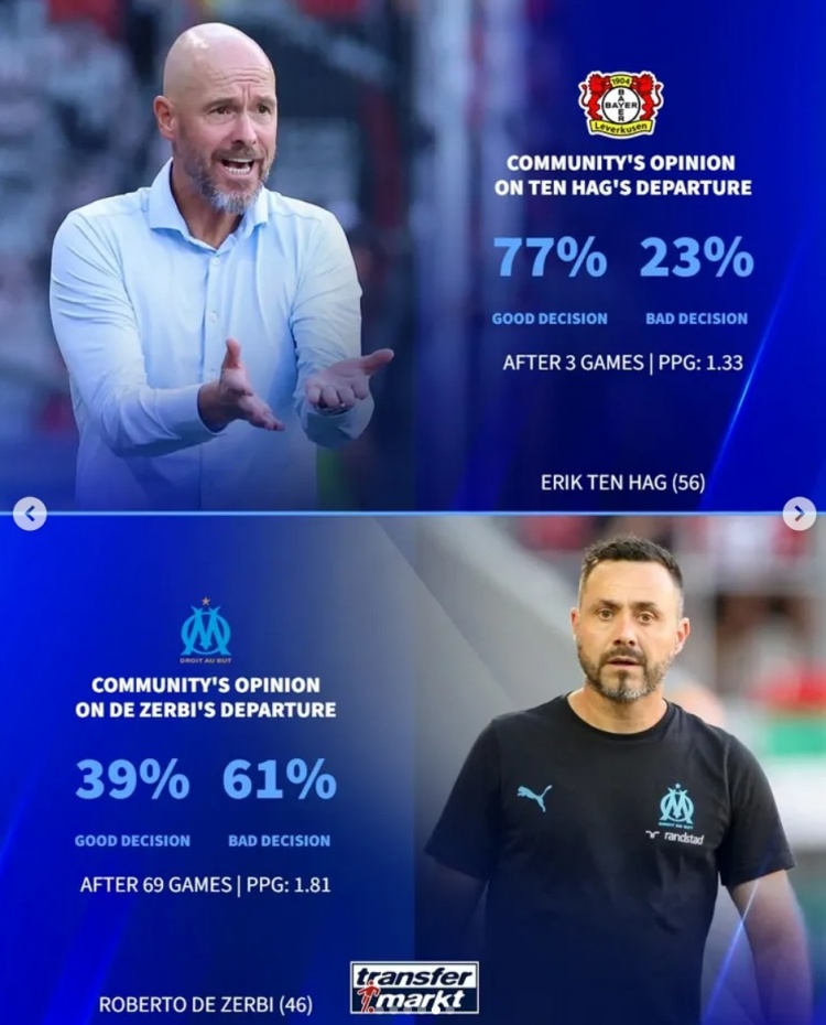 滕哈赫(勒沃库森):3场,场均1.33分。77%支持,23%反对。