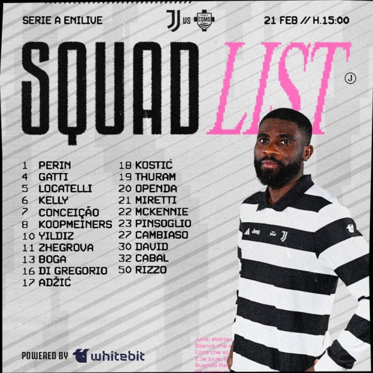 直播吧2月21日讯 北京时间今天晚上22点,尤文将在意甲第26轮比赛中主场对阵科莫,尤文公布了此役的球员名单。布雷默、霍尔姆因伤缺席,卡卢卢停赛缺席,戴维回归。