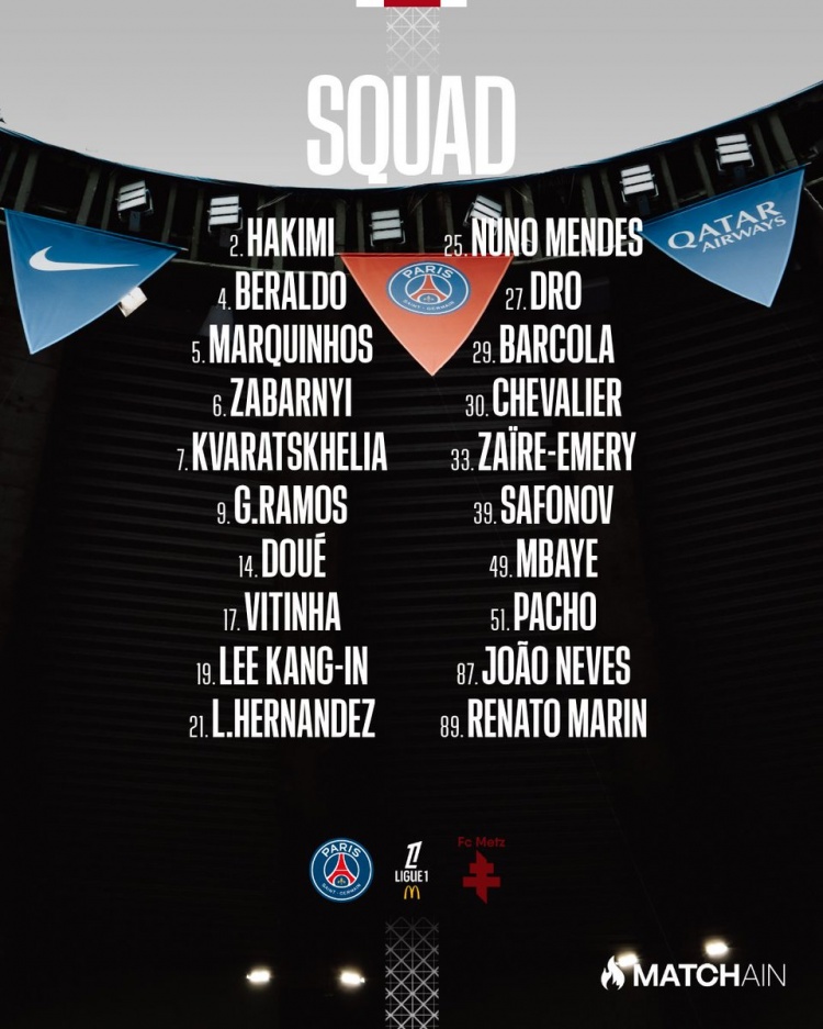 前锋:7-克瓦拉茨赫利亚、9-贡萨洛·拉莫斯、14-杜埃、29-巴尔科拉、49-姆巴耶
