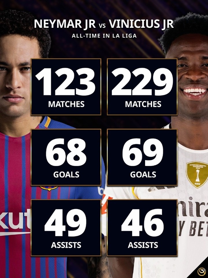 >西甲数据对比:内马尔123场68球49助,维尼修斯229场69球46助