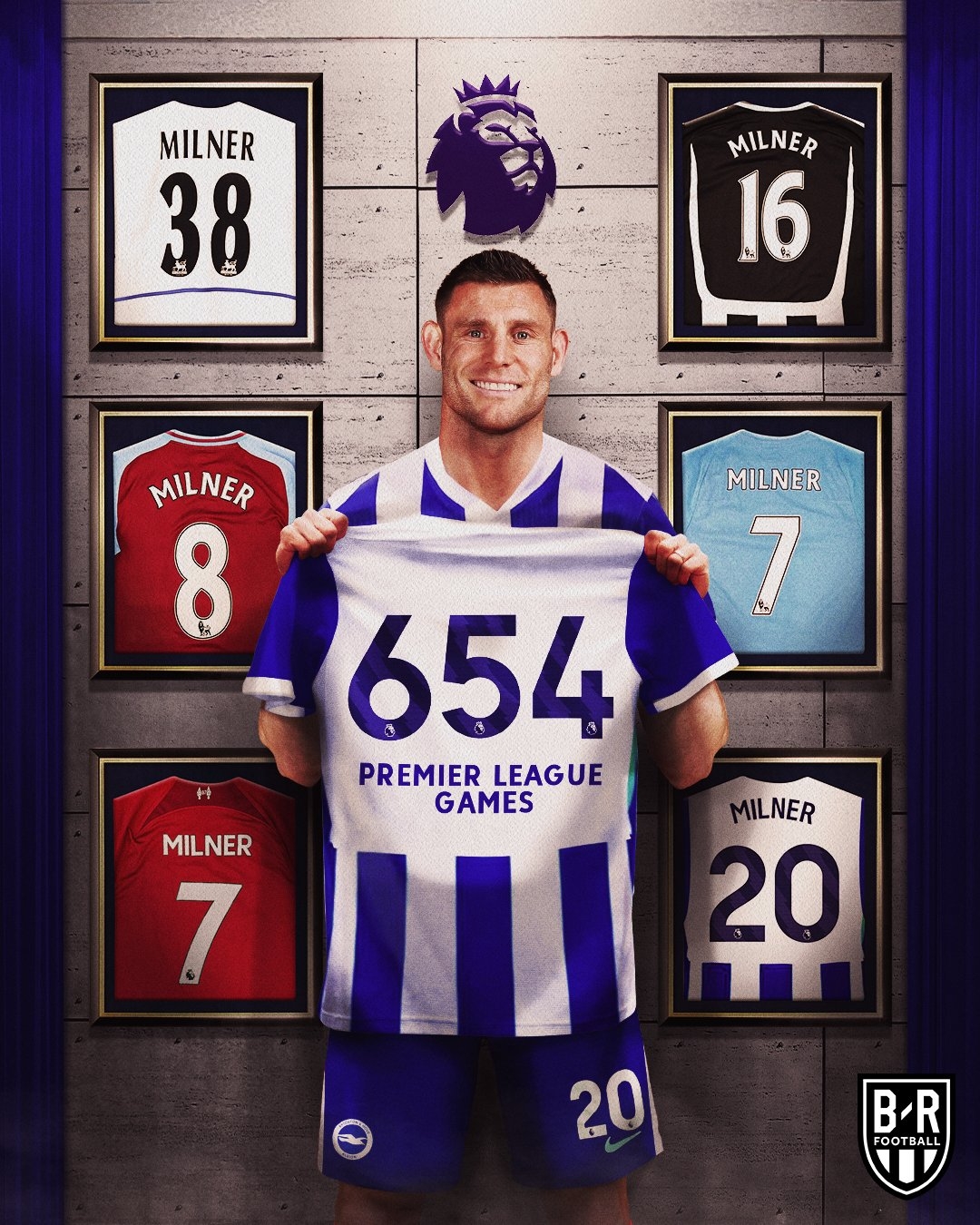 米尔纳从利兹联出道,2002年16岁时上演英超首秀,成为当时英超历史最年轻的进球球员,此后分别效力于纽卡、维拉、曼城、利物浦和布莱顿。