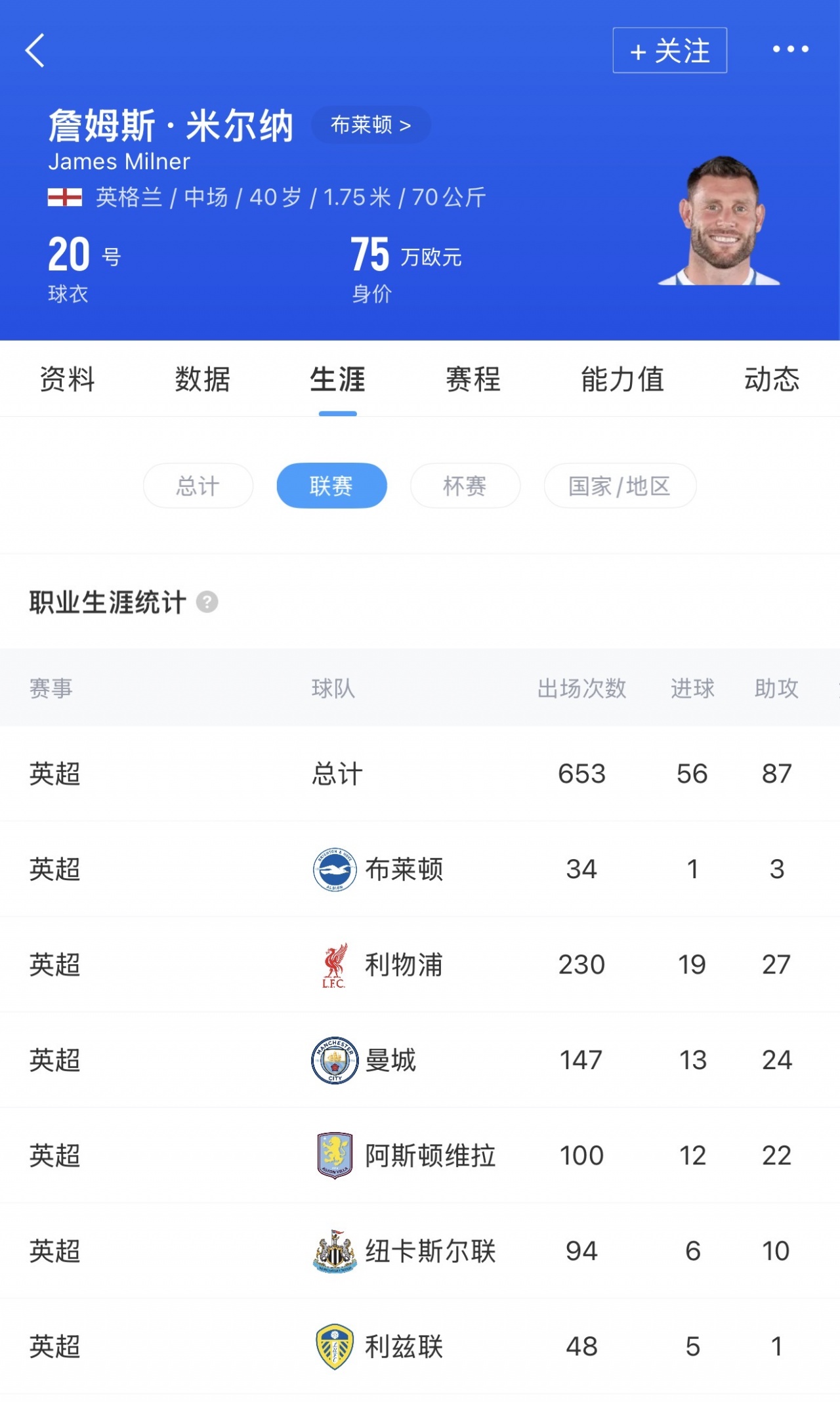 直播吧02月21日讯 23点布莱顿vs布伦特福德首发公布,40岁的米尔纳首发登场,迎来个人英超第654次出场,这一数据打破了他自己与加雷斯·巴里保持的英超历史出场纪录。