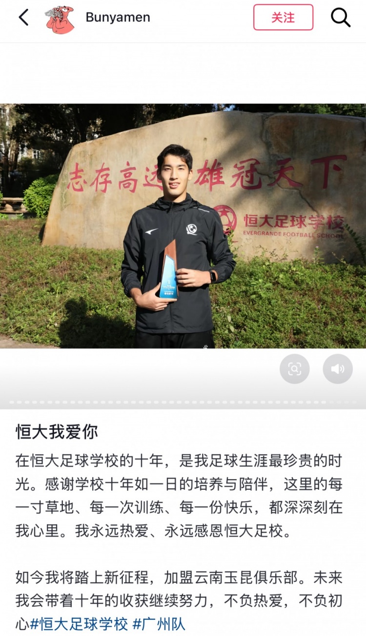 如今我将踏上新征程,加盟云南玉昆俱乐部。未来我会带着十年的收获继续努力,不负热爱,不负初心。