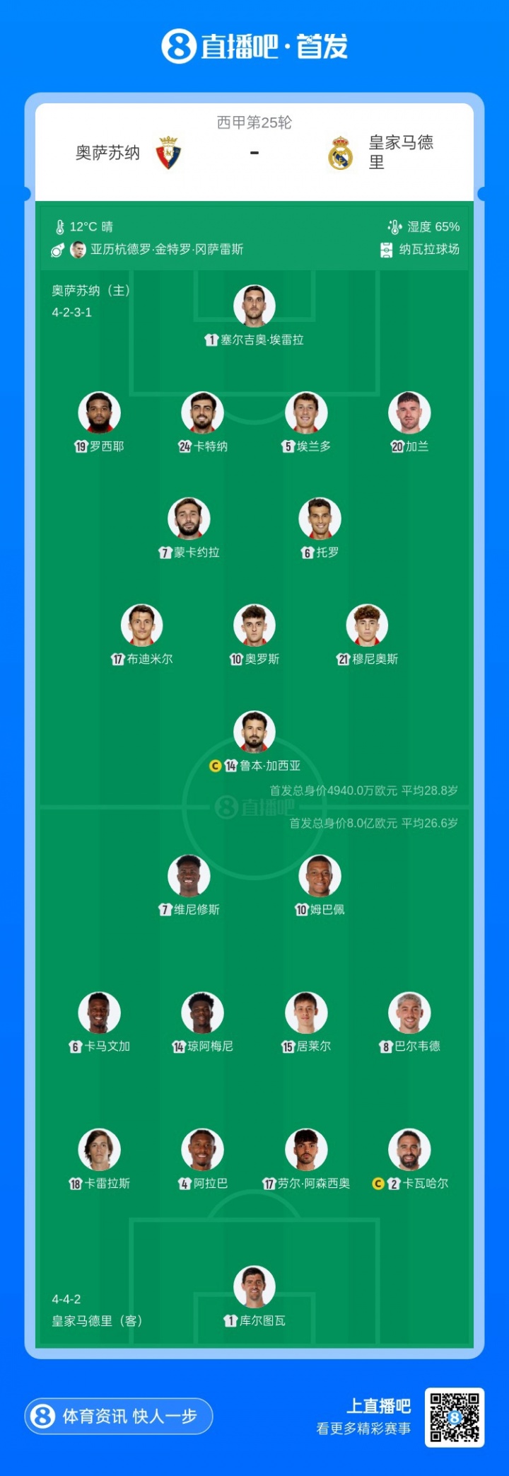 直播吧2月22日讯 西甲第25轮,奥萨苏纳主场迎战皇家马德里,赛前首发名单公布。【本场比赛,皇马放马姆巴佩、维尼修斯、居莱尔出战,后防线上卡瓦哈尔、阿拉巴获得首发机会。】