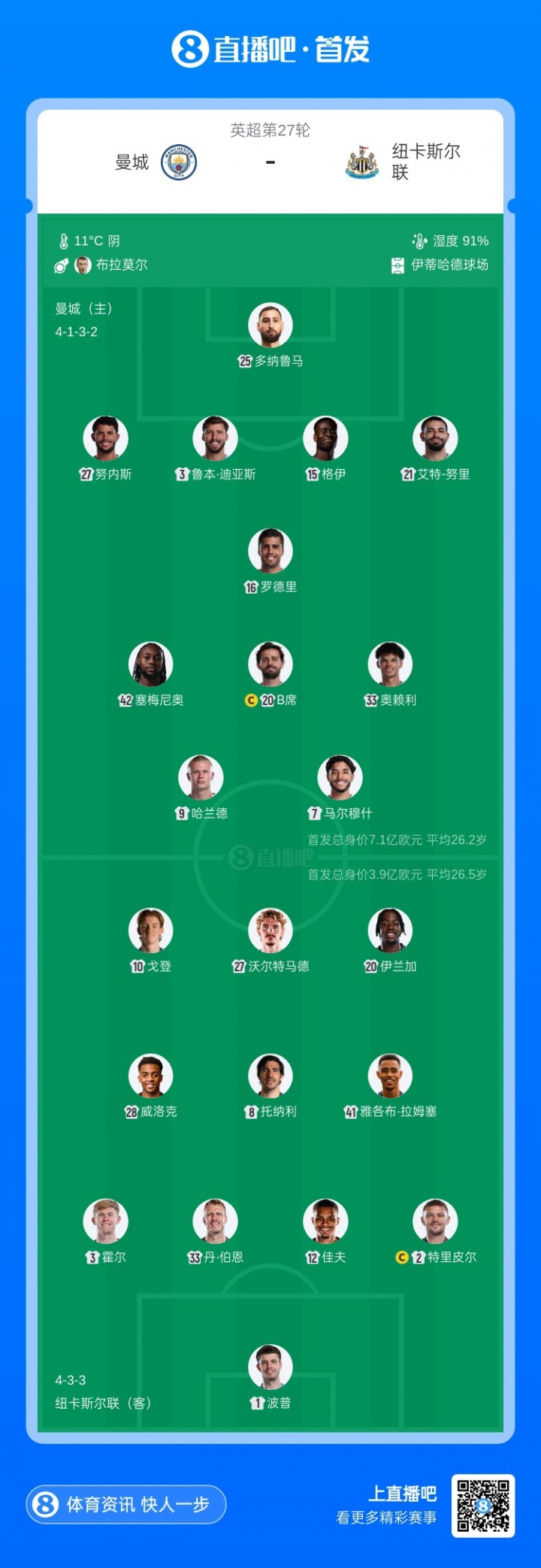 曼城首发:25-多纳鲁马、27-努内斯、3-鲁本·迪亚斯、15-格伊、21-艾特-努里、16-罗德里、20-B·席尔瓦、33-奥赖利、42-塞梅尼奥、7-马尔穆什、9-哈兰德