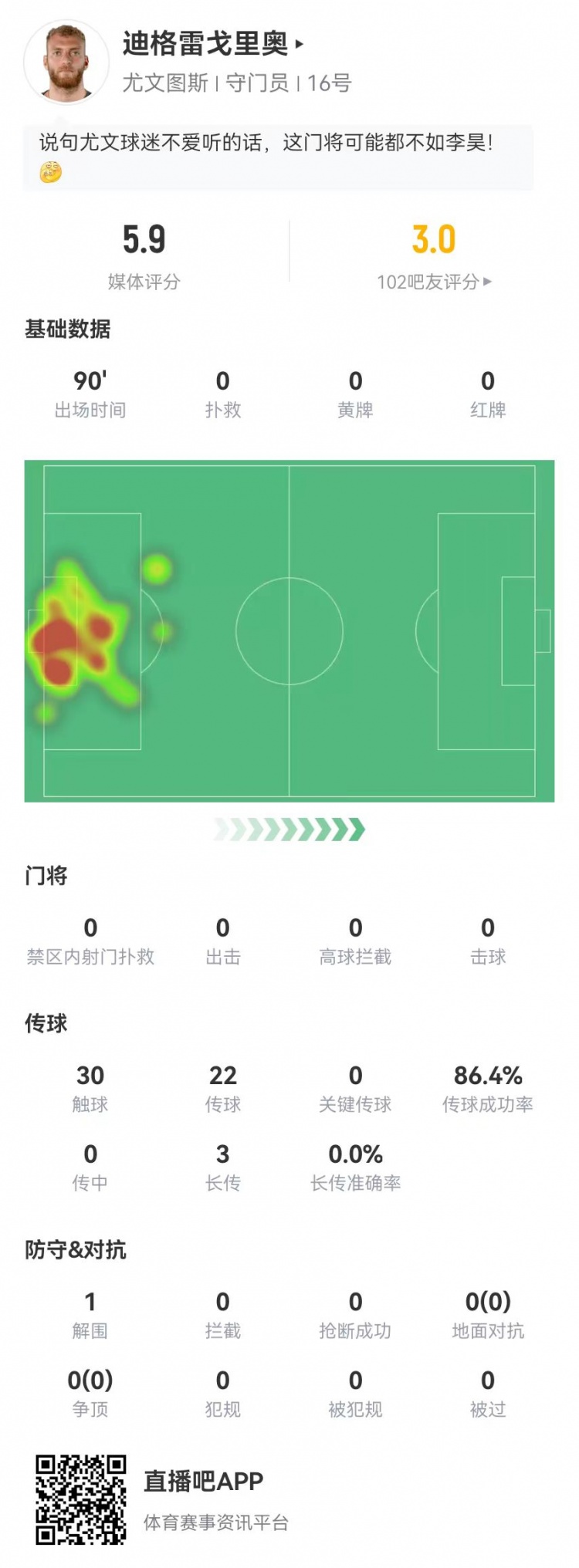 >迪格雷戈里奥本场丢2球+0扑救 3长传0成功 获评5.9分全场最低