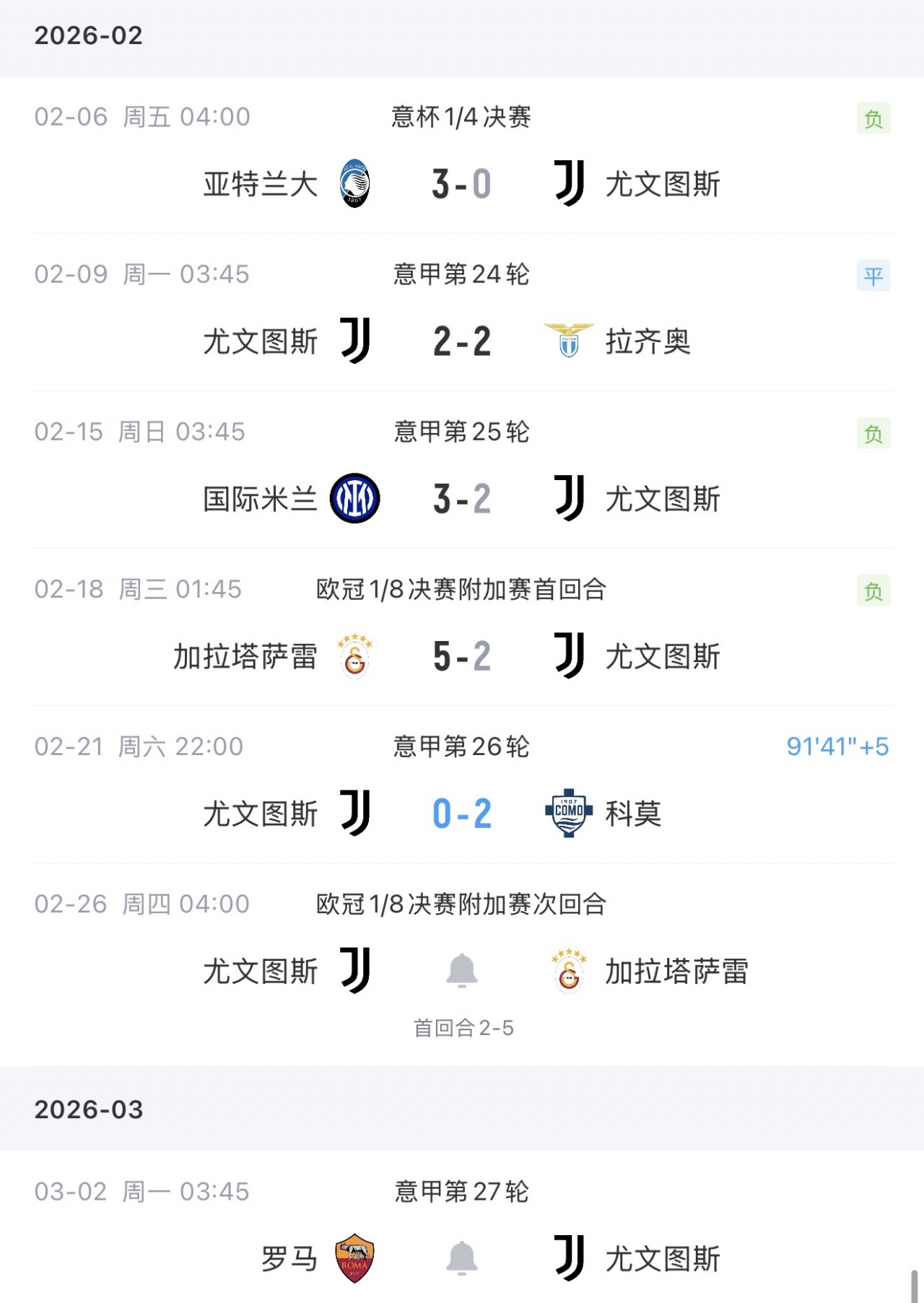 2月26日4点,尤文将在欧冠1/8决赛附加赛次回合对阵加拉塔萨雷,首回合球队客场2-5落败,这场比赛之后球队将在联赛迎来与罗马的对决。