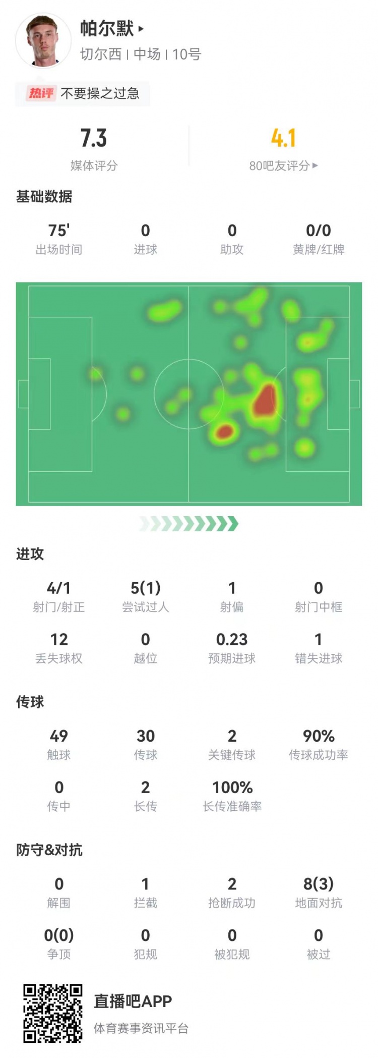 直播吧2月22日讯 切尔西本轮英超对阵伯恩利,帕尔默本场数据如下: