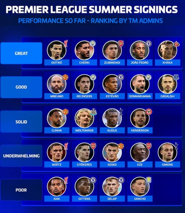 直播吧2月22日讯 《转会市场》为去年夏窗的英超引援进行了分档评级,埃基蒂克等5将获评最佳。
