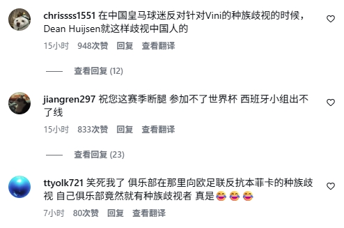 直播吧02月22日讯 皇马后卫赫伊森的ins账号转发一条多图动态,该动态的首张图片有明显的辱华意味,尽管后续取消了该转发,但还是引发轩然大波。如今赫伊森的最新一条社媒下已经被中国球迷刷出8000条左右的评论,要求他道歉。