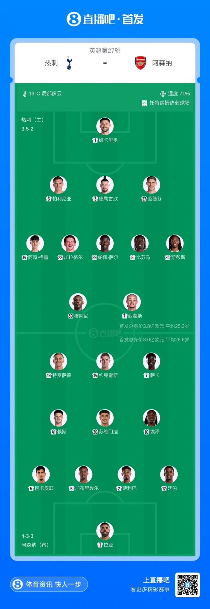 热刺首发:1-维卡里奥、37-范德芬、24-斯彭斯、3-德勒古欣、6-帕利尼亚、8-比苏马、14-阿奇·格雷、29-萨尔、22-加拉格尔、7-哈维·西蒙斯、39-穆阿尼