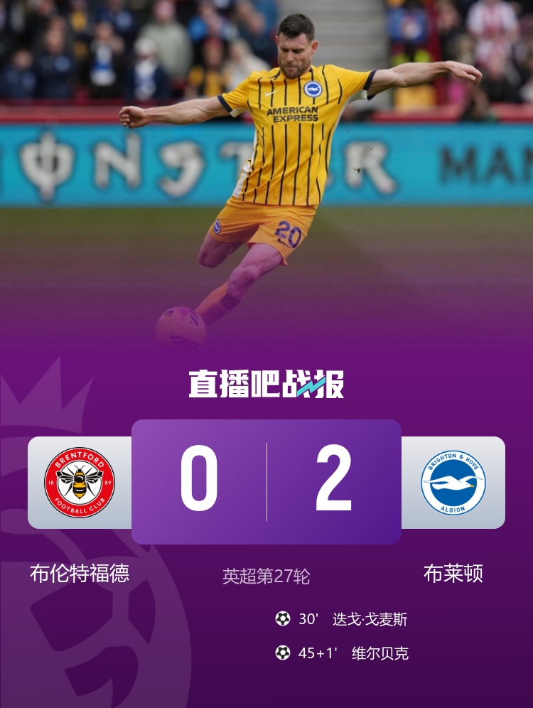 直播吧2月22日讯 北京时间2月21日23:00,2025-26赛季英超联赛第27轮,布伦特福德坐镇布伦特福德社区球场迎战布莱顿,本场比赛布莱顿中场米尔纳迎来英超第654次出场,成为英超历史出场王。上半场迭戈·戈麦斯破门,维尔贝克再下一城,布莱顿暂2-0布伦特福德;下半场两队均未能改写比分,最终布伦特福德0-2不敌布莱顿,联赛两轮不胜。