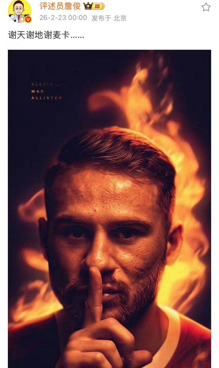 赛后知名解说詹俊在社媒评论道:“谢天谢地谢麦卡…”。