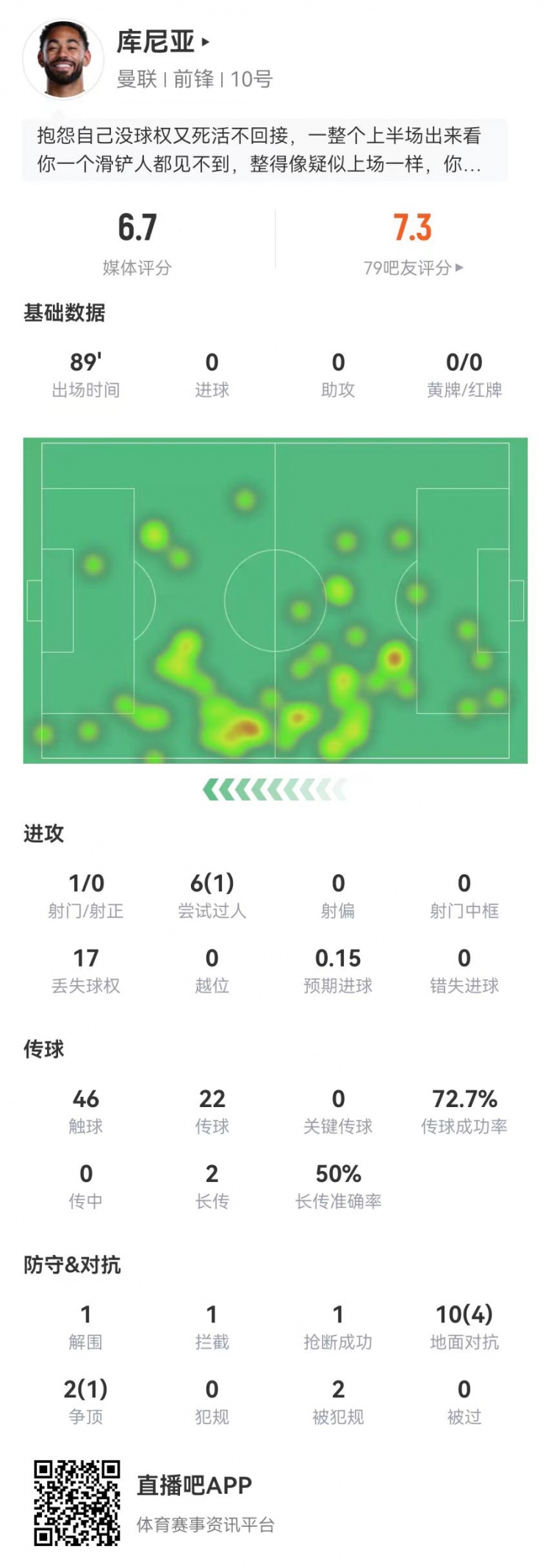 直播吧2月24日讯 曼联在本轮英超对阵埃弗顿,库尼亚在本场比赛数据如下: