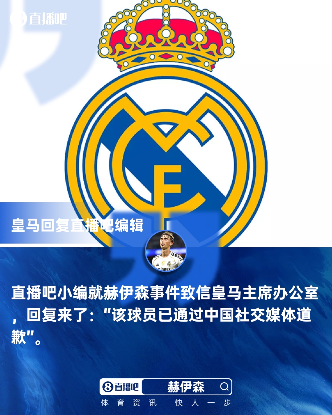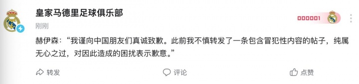北京时间今天下午,两封邮件中以球迷名义发送的邮件得到了回复。皇马主席办公室的邮件附带了赫伊森在B站致歉的截图,称“球员已通过中国社交媒体道歉”。