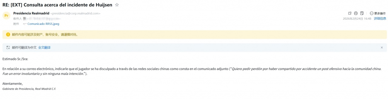 直播吧02月24日讯 日前皇马球员赫伊森在社媒转发了一条含有辱华性质的内容,事件发生后,直播吧编辑分别以球迷名义和媒体名义向皇马主席办公室发去了两封邮件,希望就此事得到解释和致歉。