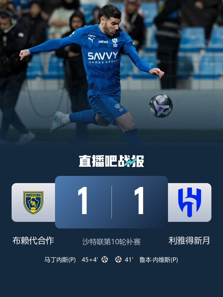 直播吧2月25日讯 沙特联第10轮补赛,布赖代合作坐镇主场布赖代阿卜杜拉国王体育场迎战利雅得新月。上半场,特奥造点,鲁本·内维斯点射先拔头筹。马丁内斯造点+点射扳平。易边再战,穆法利杰中横梁。最终布赖代合作1-1利雅得新月。积分榜方面,新月先赛55分追平胜利,布赖代合作40分第五。
