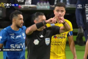 第39分钟,新月左路进攻渗透进禁区,特奥禁区内跟进被身后踢倒,VAR介入主裁亲自回看后判罚点球,鲁本·内维斯主罚点球命中,新月1-0领先↓