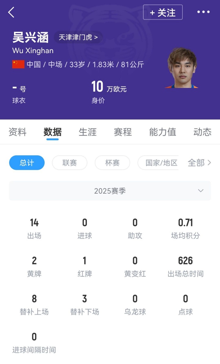 吴兴涵现年33岁,边路多面手,出道于山东泰山,共代表泰山出战278场比赛,贡献21球32助攻,随队获得过1次中超冠军和4次足协杯冠军。上赛季吴兴涵在中超出场14次,没有进球和助攻。