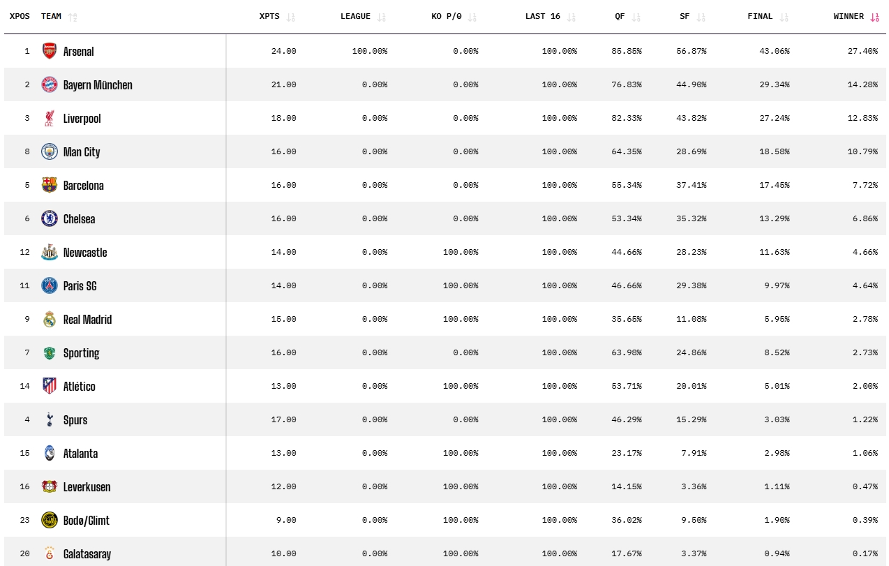 直播吧02月27日讯 2025/26赛季欧冠淘汰赛抽签结果揭晓,数据机构Opta的超级计算机给出了最新的夺冠概率,阿森纳断层领跑。