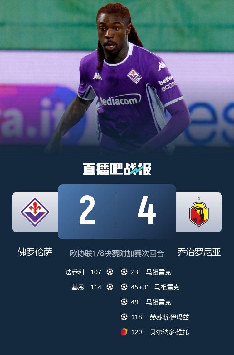 最终,佛罗伦萨加时2-4总比分5-4乔治罗尼亚,晋级16强。