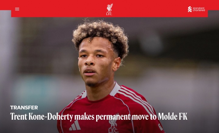 直播吧2月28日讯 利物浦官方宣布,19岁边锋特伦特·科内·多尔蒂加盟莫尔德,据悉转会费75万欧元,这笔交易包含了回购条款以及二转分成条款。