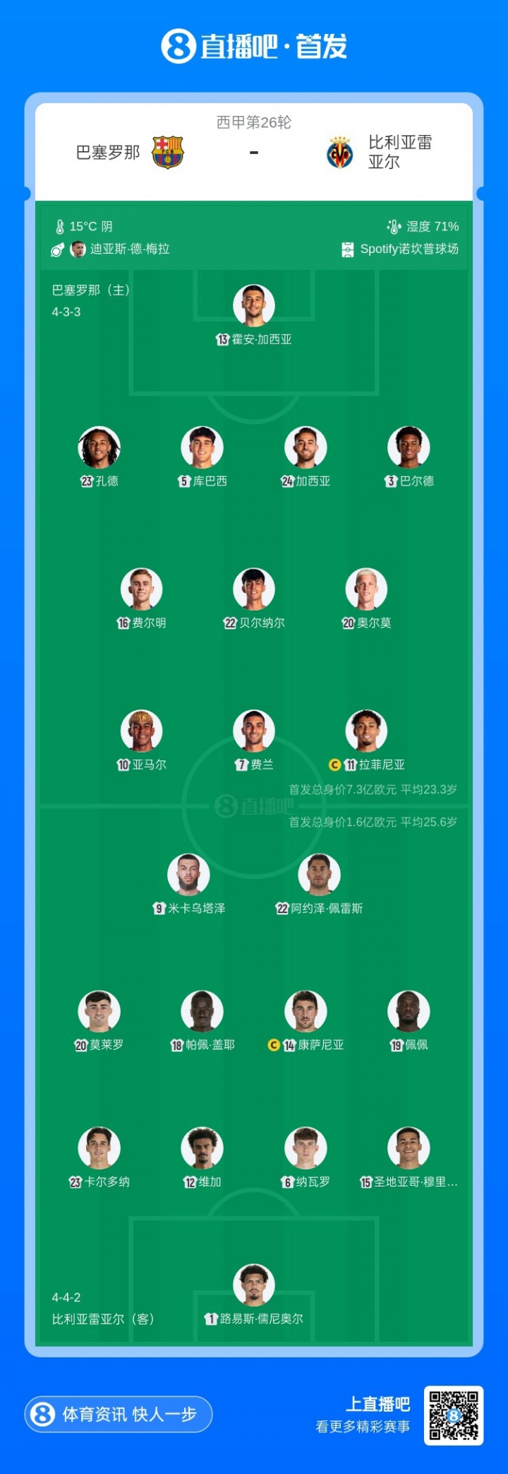 直播吧02月28日讯 北京时间23:15,西甲第26轮,巴萨对阵比利亚雷亚尔。赛前,双方首发出炉。【巴萨方面,德容伤缺,佩德里替补待命,亚马尔、拉菲尼亚、费兰先发,奥尔莫、费尔明出战;比利亚雷亚尔方面,佩佩、盖耶、米卡乌塔泽先发,帕雷霍、托马斯替补】