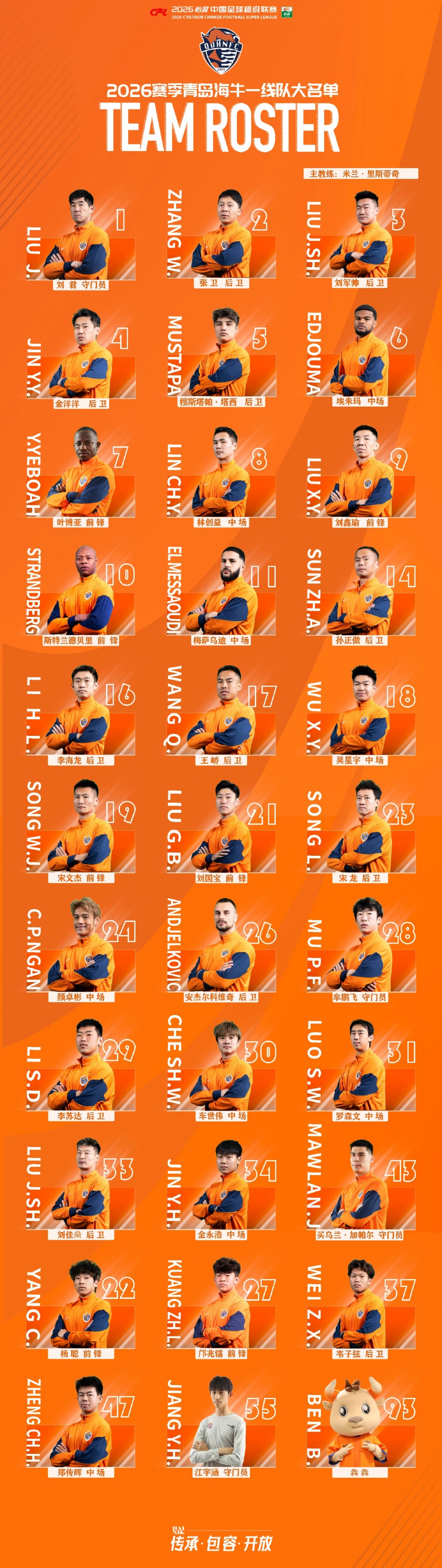 2026怡宝中国足球超级联赛青岛海牛一线队大名单正式出炉