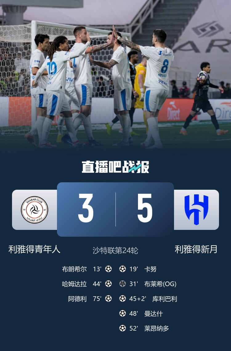 第75分钟,亚斯拉姆助攻阿德利破门,利雅得青年人3-5利雅得新月。↓