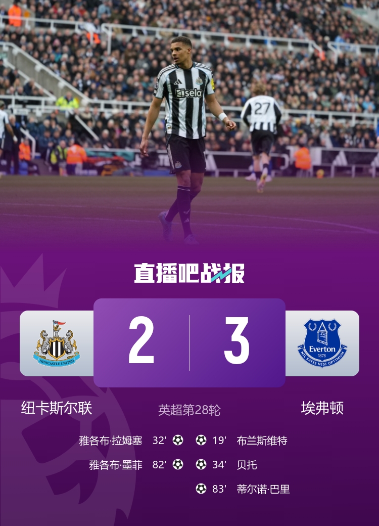 全场比赛结束,纽卡斯尔联2-3埃弗顿。