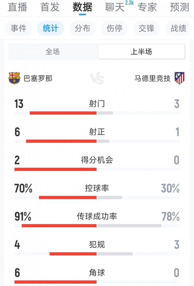 直播吧3月4日讯 在国王杯半决赛次回合,巴萨半场战罢2-0领先,以下为双方半场数据对比: