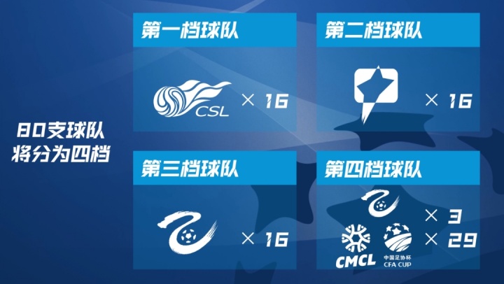 80支球队分别为16支中超球队、16支中甲球队、19支中乙球队(俱乐部B队不参加足协杯)及29支业余球队。上述四个级别的球队将分为四档,其中,16支中超球队为第一档球队,16支中甲球队为第二档球队;在19支中乙球队中,本年度中乙联赛准入名单及递补名单排名靠前的16支球队为第三档球队;剩余3支中乙球队及29支业余球队为第四档球队。