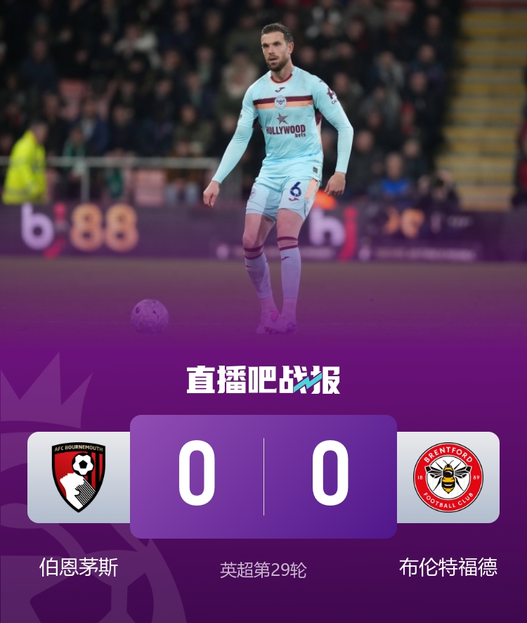 直播吧3月4日讯 北京时间3月4日凌晨3时30分,2025-26赛季英超第29轮在活力球场展开角逐,伯恩茅斯主场迎战布伦特福德。上半场塔韦尼耶屡造威胁,下半场塔韦尼耶两次中柱,埃瓦尼尔森进球越位。最终伯恩茅斯主场0-0战平布伦特福德,伯恩茅斯联赛3连平积40分位居第9,布伦特福德积44分仍名列第7。
