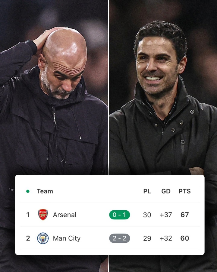 直播吧03月05日讯 英超第29轮结束,阿森纳1-0击败布莱顿,曼城2-2战平诺丁汉森林。本轮之后,阿森纳多赛一场领先曼城7分,占有争冠的主动权。