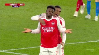 第9分钟,阿森纳右路进攻,廷伯推进分球,萨卡带球盘带内切直接左脚兜射,皮球折射后击中门将脚后跟弹入网窝!阿森纳1-0领先↓
