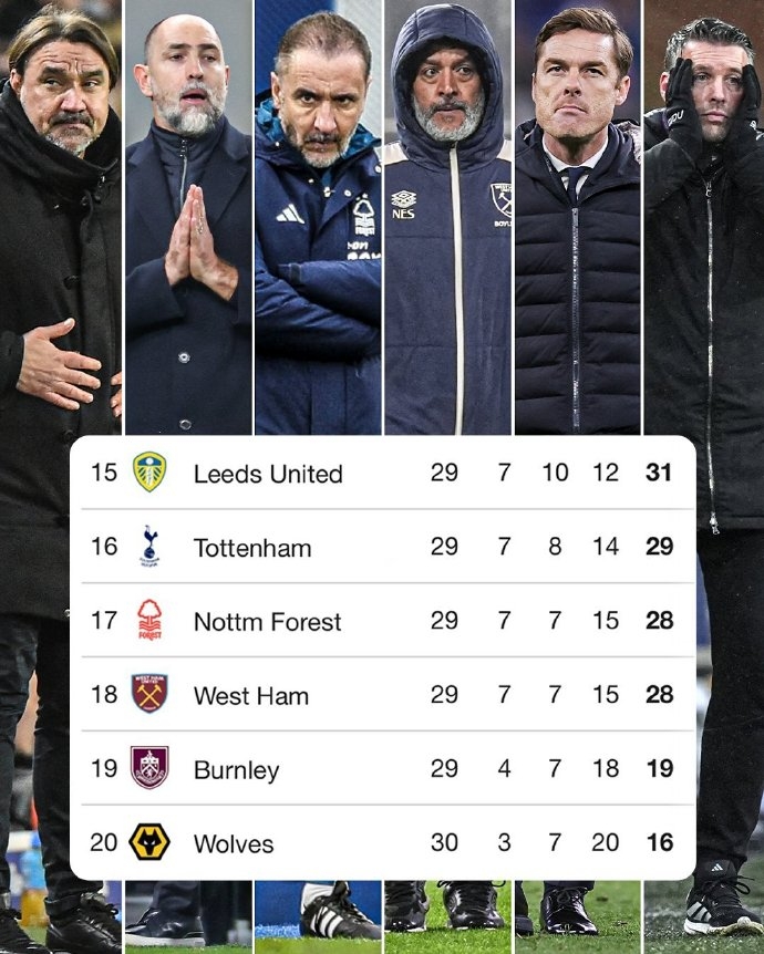 保级区方面,排名第16的热刺29分,只领先第17的森林1分。目前在降级区的三支球队:西汉姆28分(与森林同分),伯恩利19分,狼队16分。