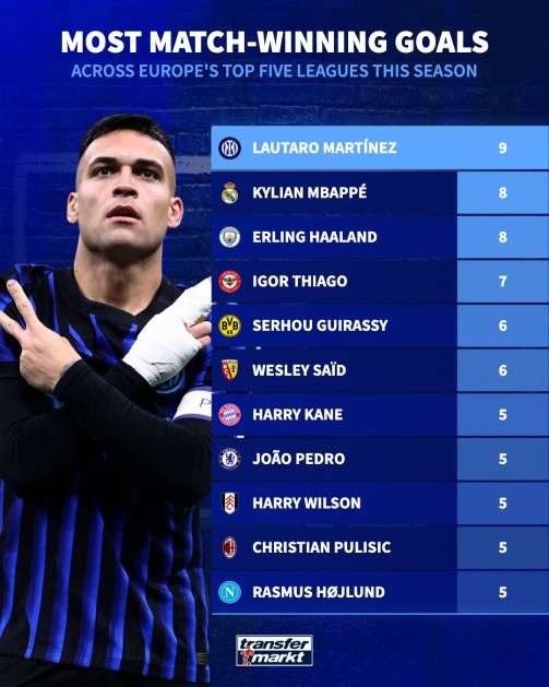 直播吧3月6日讯 德国转会市场盘点了本赛季五大联赛打进制胜球球员情况,劳塔罗以9球居首,姆巴佩和哈兰德以8球并列次席。