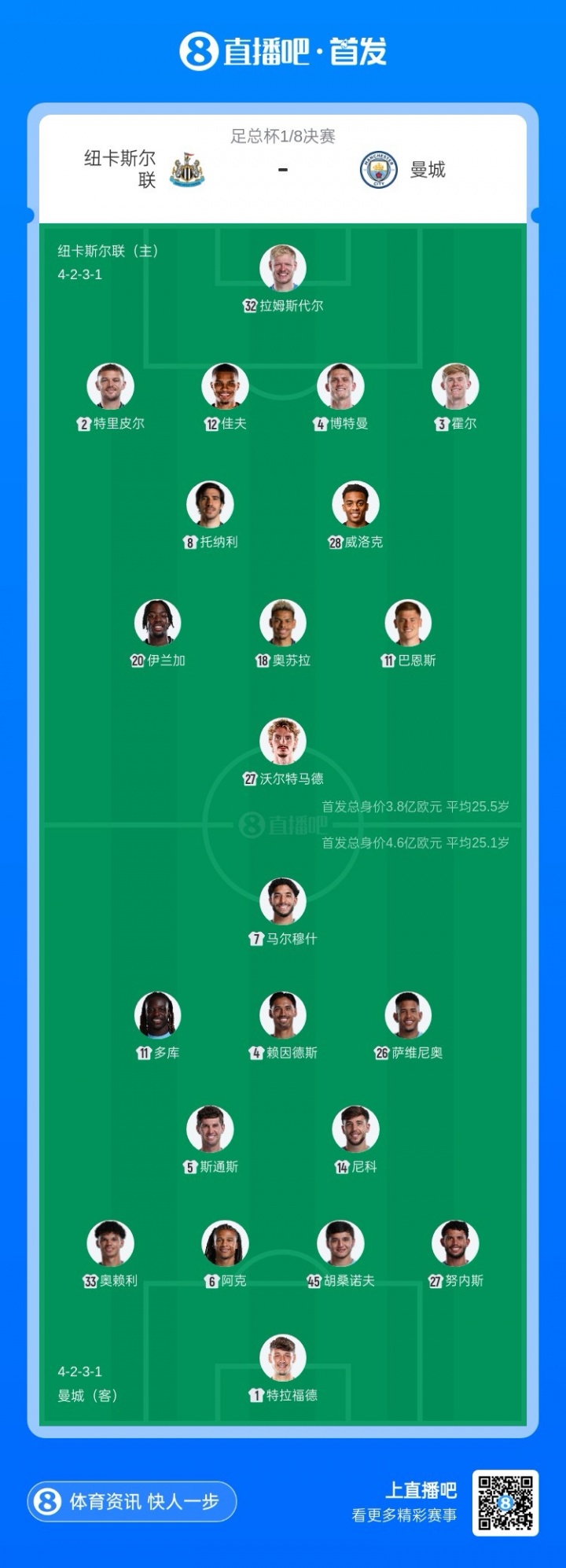 直播吧3月8日讯 足总杯16强对阵,纽卡对阵曼城比赛即将打响。赛前首发出炉。