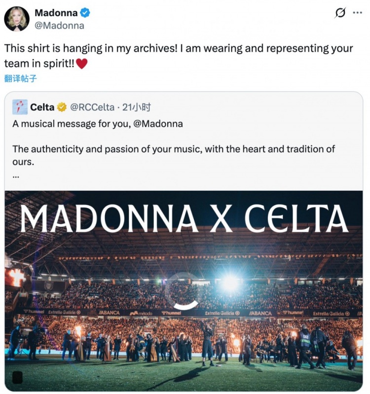 麦当娜在社媒上写道:“这件球衣被我珍藏在自己的收藏中!我也在精神上穿着并代表着你们的球队!!”