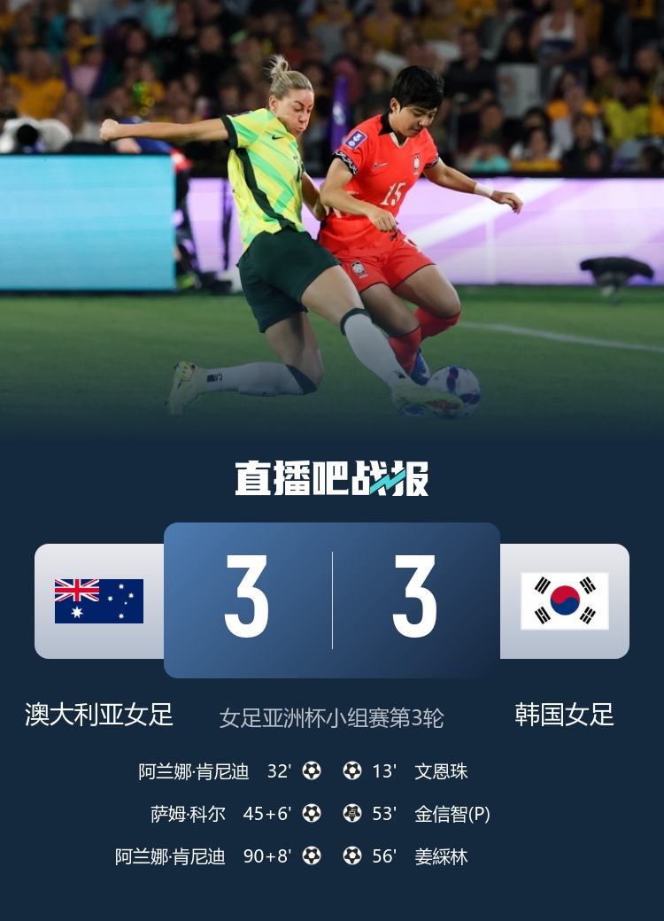 直播吧3月8日讯 北京时间3月8日下午17:00,女足亚洲杯小组赛第3轮,澳大利亚女足在澳洲新西兰银行体育场对阵韩国女足。上半场,全佑静助攻文恩珠铲射破门,阿兰娜·肯尼迪扳平,富德助攻科尔反超。下半场,内文手球金信智点射命中,姜綵林低射得手,阿兰娜·肯尼迪压哨绝平。全场结束,澳大利亚女足3-3韩国女足。本场过后,韩国女足积7分排名小组第一,澳大利亚女足积7分排名第二,双双晋级。